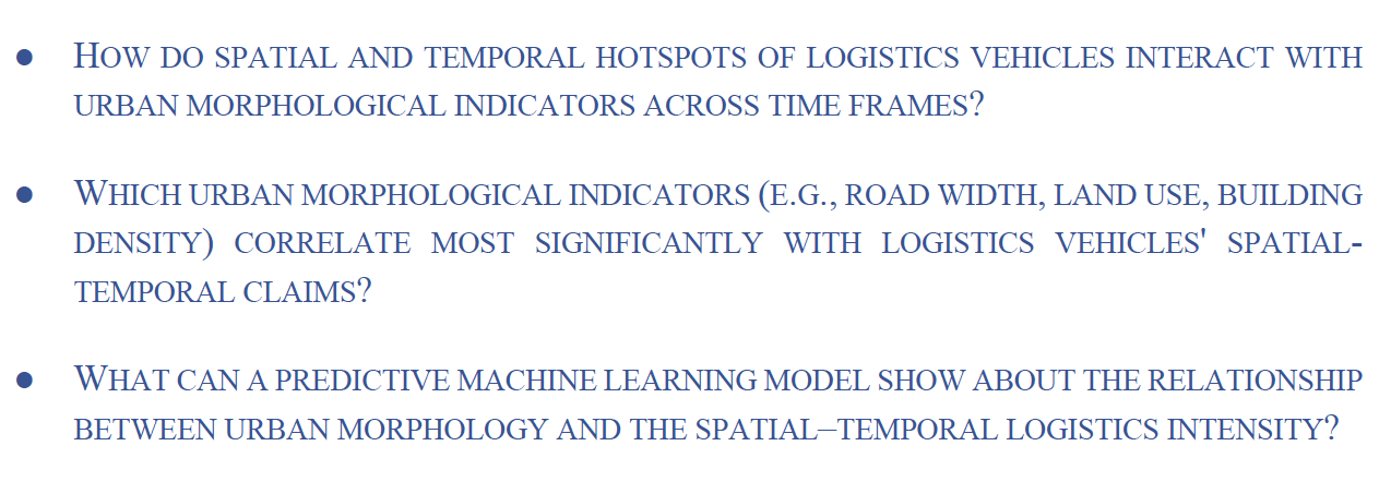 The thesis rightly identifies a persistent gap in urban logistics research: the neglect of temporal dynamics in logistics operations. Much of the existing literature, as the author notes, treats logistics activity as static, overlooking fluctuations in delivery schedules, dwell times, and curbside demands throughout the day. By framing logistics as a spatial-temporal phenomenon, the study captures the inherently dynamic interactions between logistics vehicles and urban morphology. This focus is timely and vital, given the rising attention to externalities such as congestion, emissions, and conflicts with other urban functions.