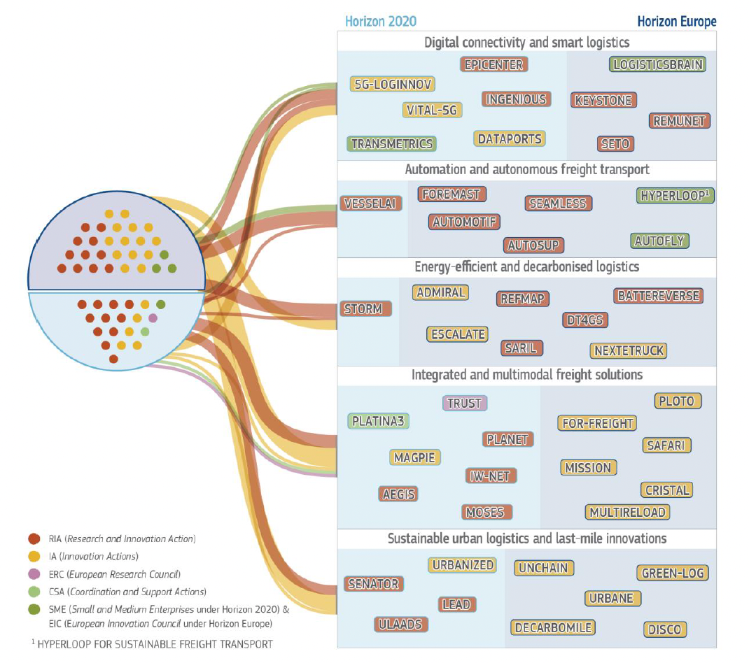To provide a comprehensive overview of the current state of EU-funded R&I in the area of efficient and sustainable logistics, the researchers reviewed 47 projects into five primary subthemes: