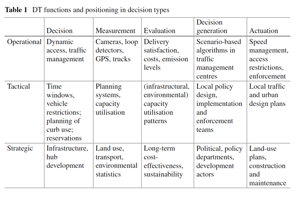 The authors frame digital twins as decision-support tools that operate across three timescales. At the operational level, they help manage daily delivery flows: rerouting vehicles, adjusting access restrictions, and monitoring congestion in real time. At the tactical level, they support weekly or monthly planning: fleet schedules, consolidation hub usage, and time-window management. At the strategic level, they inform longer-term infrastructure investment and regulatory design; the kind of decisions that play out over years.